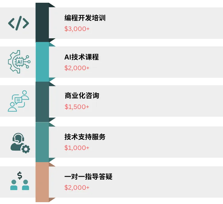 包括完整的AI工具搭建课程系统、独家PIVOT五维框架、实战演示视频。看完免费课程后一小时内购买还赠送价值$600的4大福利包。