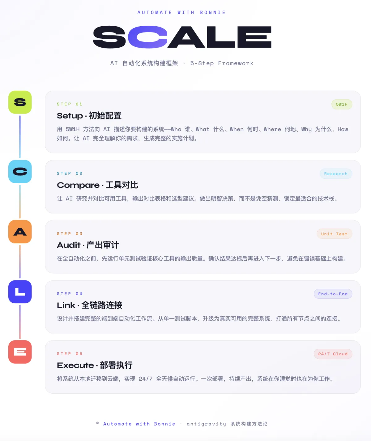 很多人在使用 Antigravity 时频繁遇到系统崩溃或逻辑死结,这往往是因为给 AI 的指令缺乏系统性。为此我总结了 SCALE 五步构建法。从初始配置、工具对比、产出审计、全链路连接到最终的部署执行,这套方法论为你提供了一条绝对清晰的系统搭建路径。